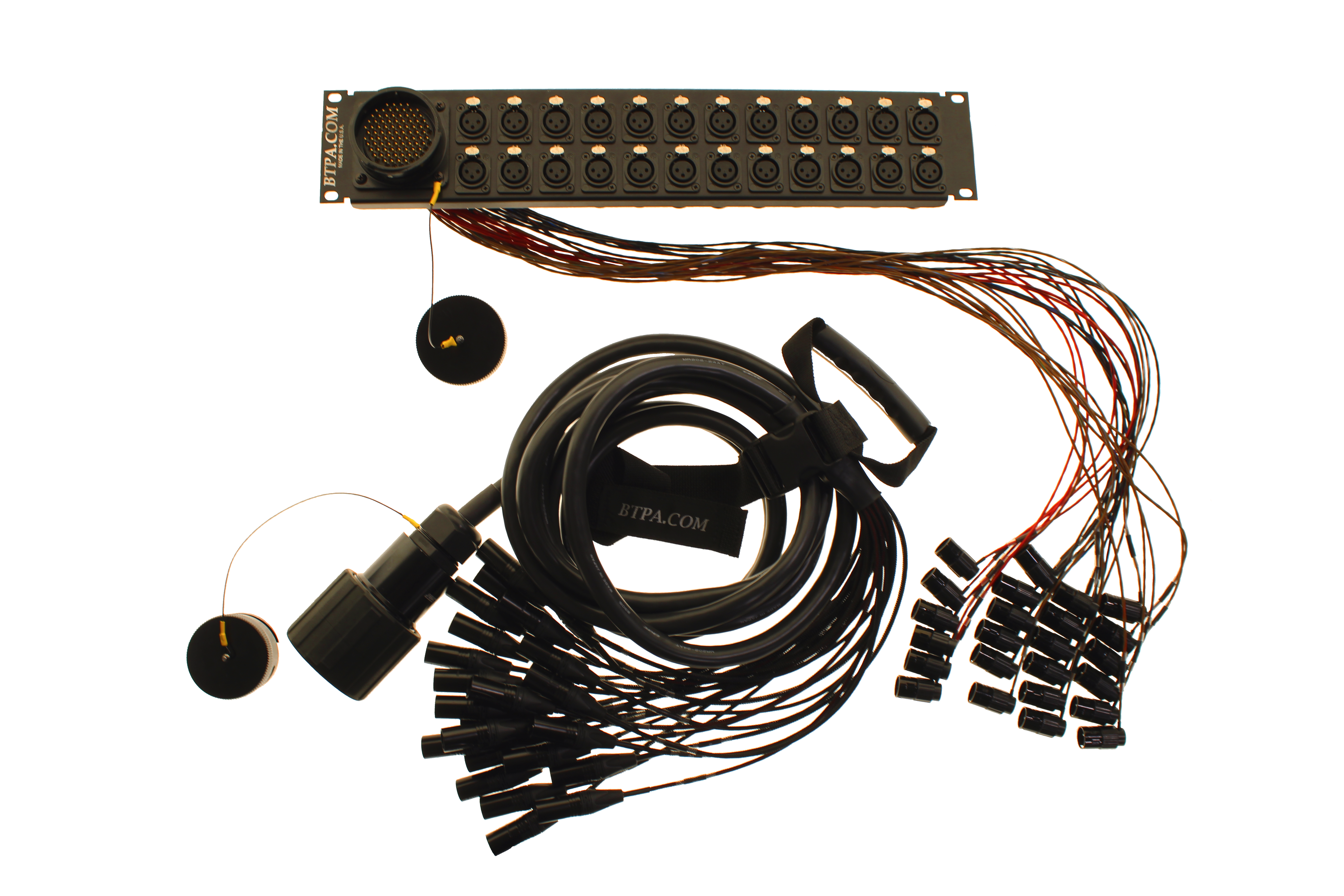 24 Channel Input Split with (24) XLRF inputs, Multipin Output, (24) Low Profile XLR Male cable tails & (1) 85 pin to XLR Male fan-out cable