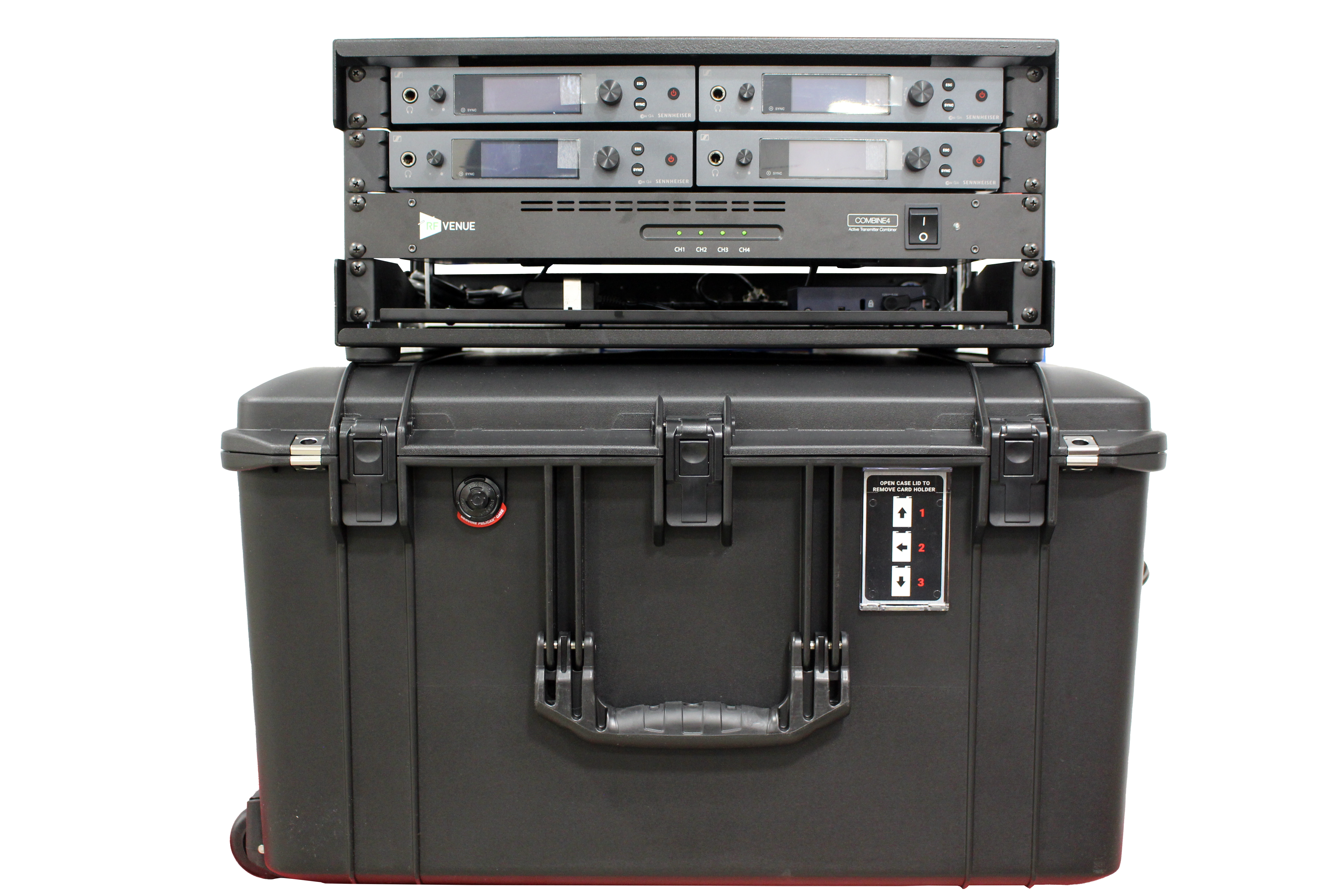 4U IEM Fly Rack with (4) Sennheiser G4 IEM systems, (1) RF Venue Combine 4 w/ CP Beam Antenna, (1) Netgear Network Switch. All packed in a Circle Three Designs 4U Gen 2 Aluminum fly rack w/ custom foamed Pelican Air 1637 case.